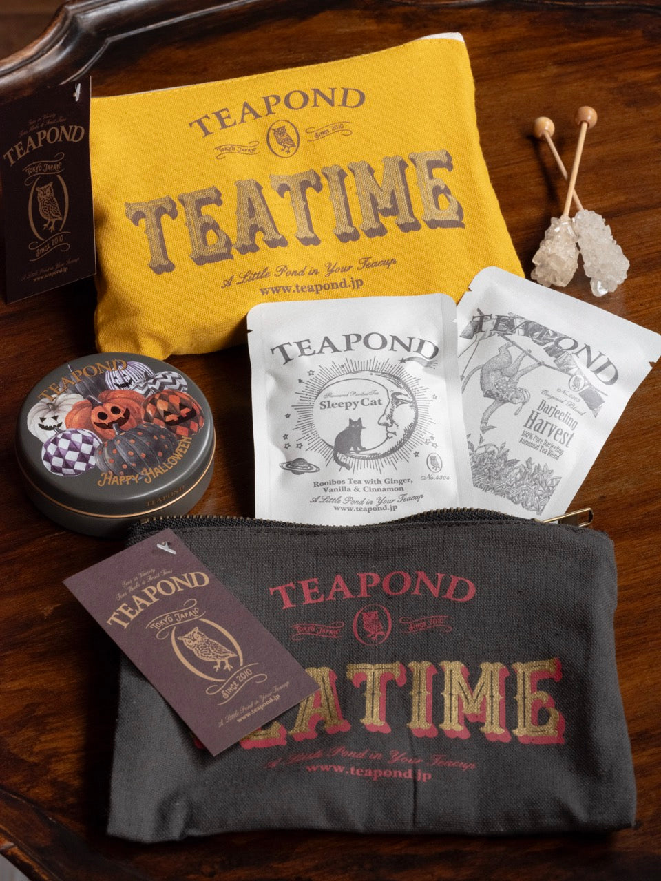 レトロな字体で「TEATIME」とデザインされたハロウィンカラーのポーチを開けたら、いつでも楽しいティータイムが始まります。
