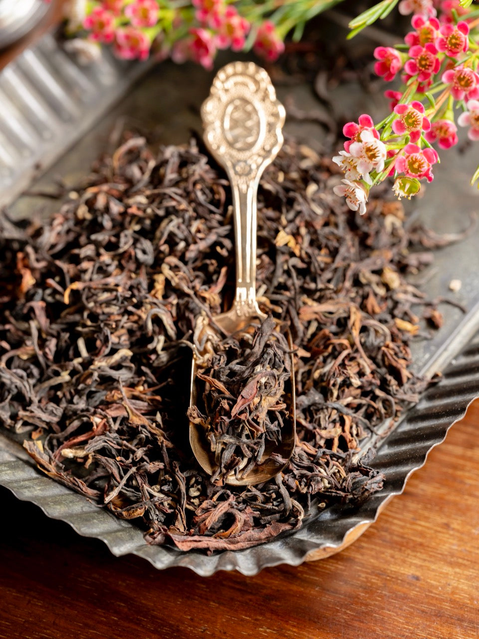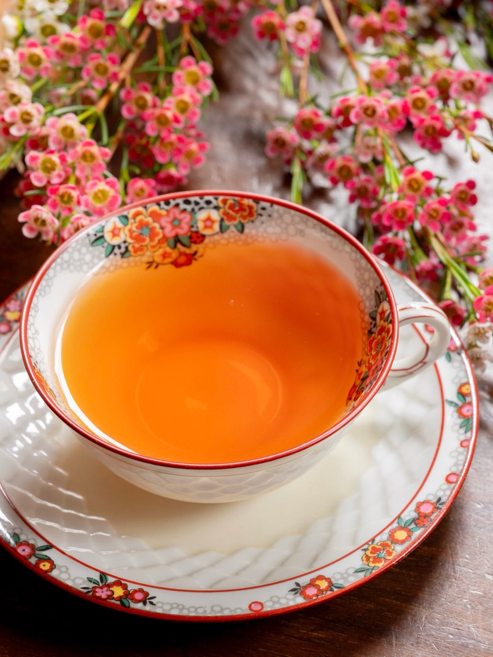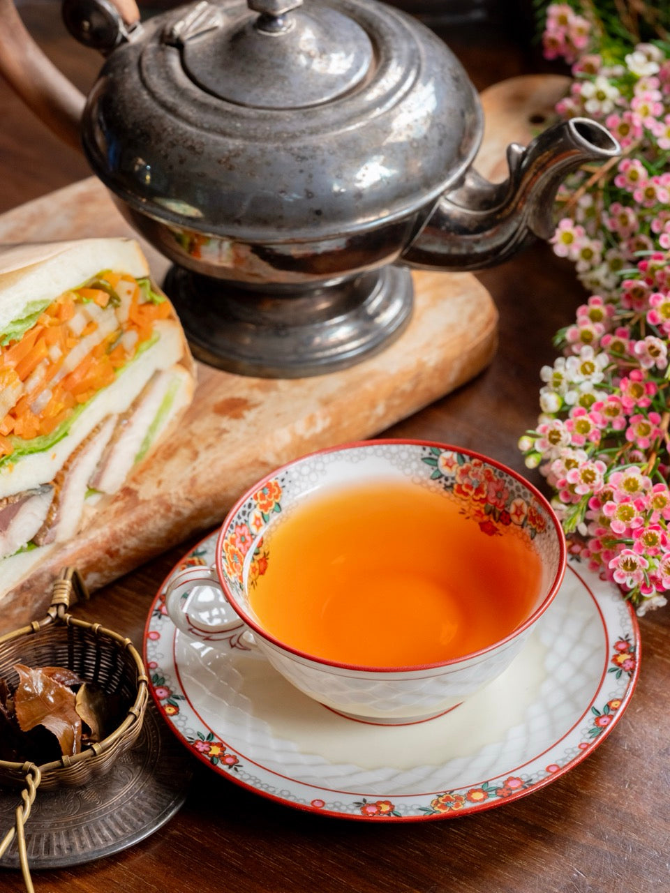 芯芽 が混ざる大きな茶葉を抽出すれば、オレンジブラウン色の茶液となります。クローナルらしい透き通った味わいと、微かに重なるザラメやナッツを思わせる甘く香ばしい余韻。