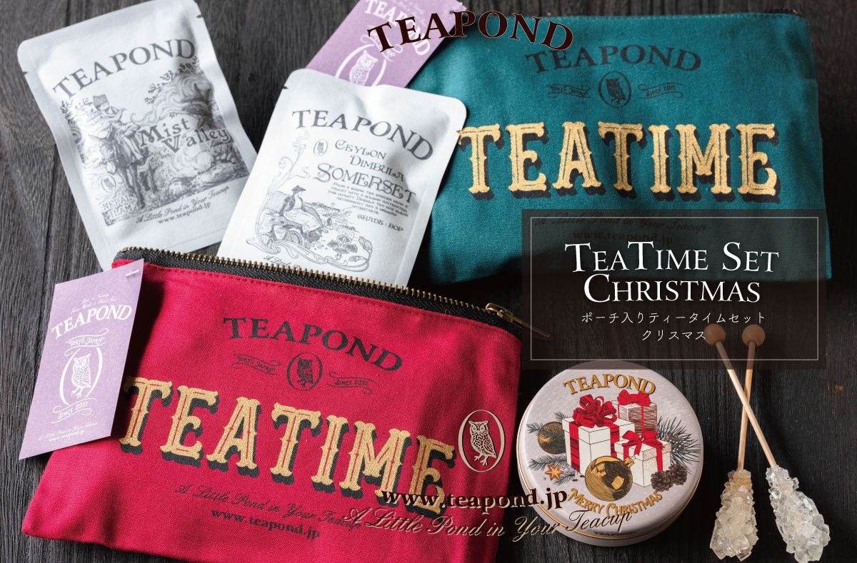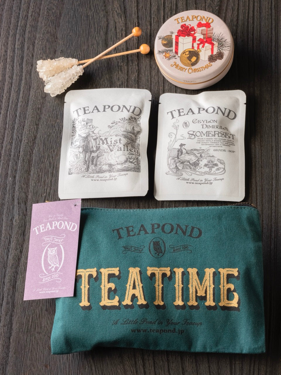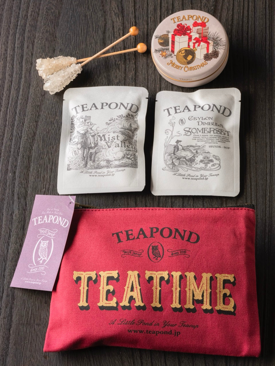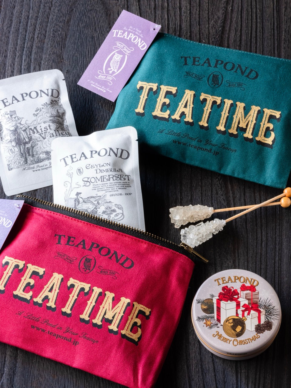 レトロな字体で「TEATIME」とデザインされ、赤や緑のクリスマスカラーのポーチを開けたら、いつでもとっておきのティータイムが始まります。