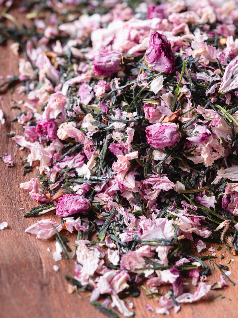 神奈川県秦野市、丹沢山系の麓に広がる「たかなし茶園」で、浅蒸し煎茶と地元産の八重桜の花びらを丁寧にブレンド。