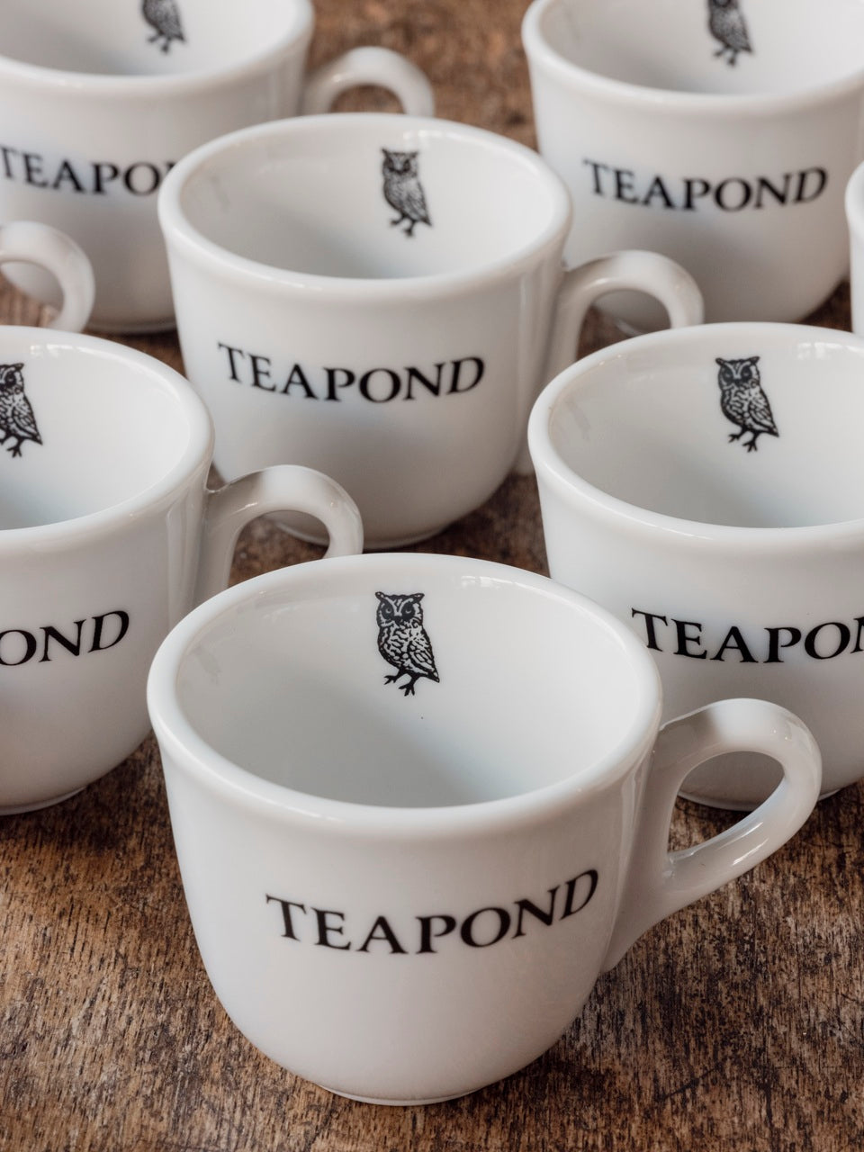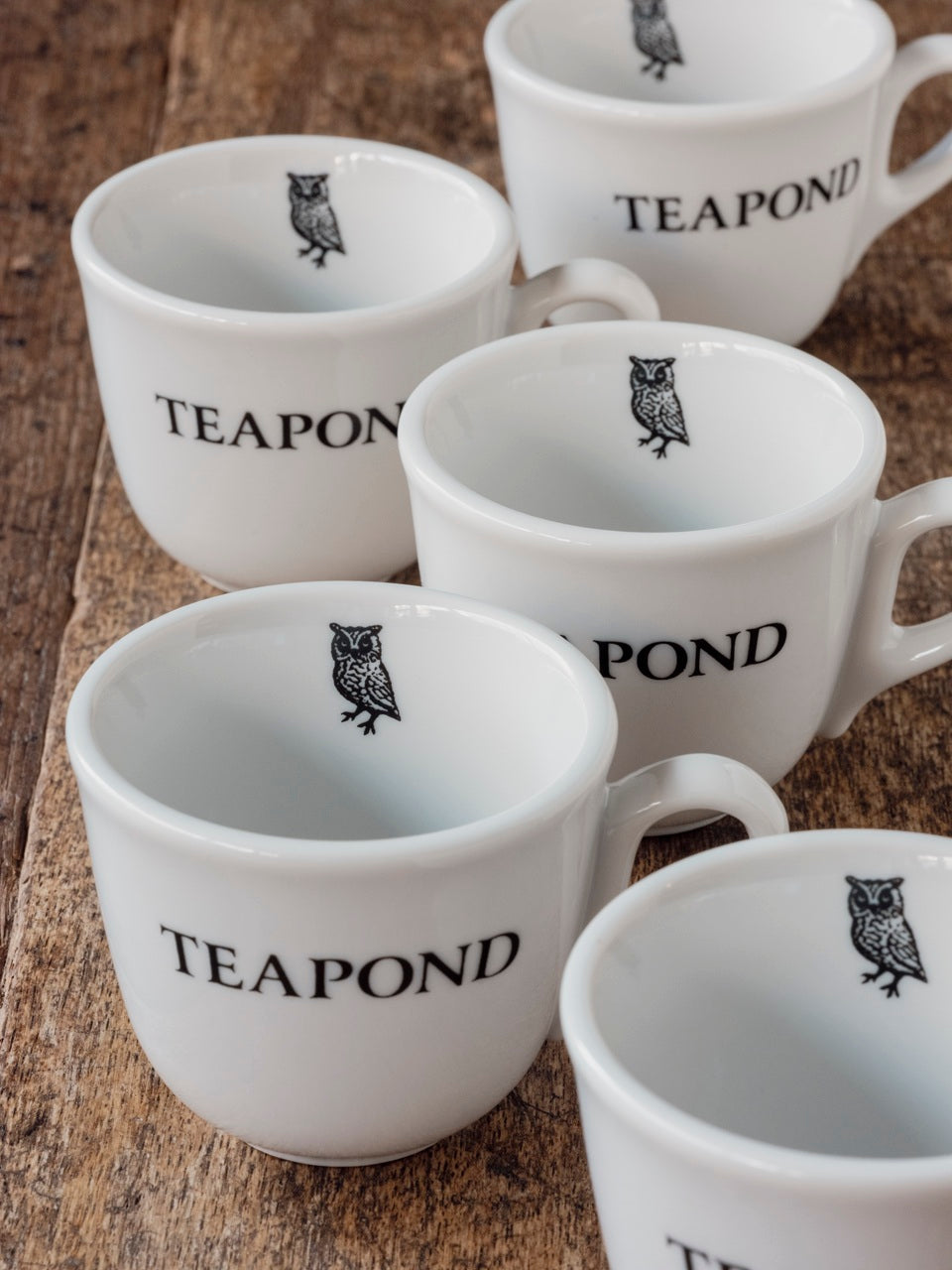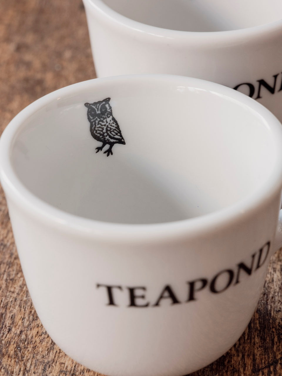 TEAPONDのロゴとカップの内側にフクロウのマークが印刷されています。フクロウの足元までお茶を注ぐとおおよそ50mlとなります。オフホワイトのシンプルで、丈夫な作りが魅力です。 茶葉をポットに入れっぱなしにして、抽出時間を重ねた味わいの変化を楽しみたい方や中国茶を工夫式で煎を重ねて味わいたい方にもおすすめです。