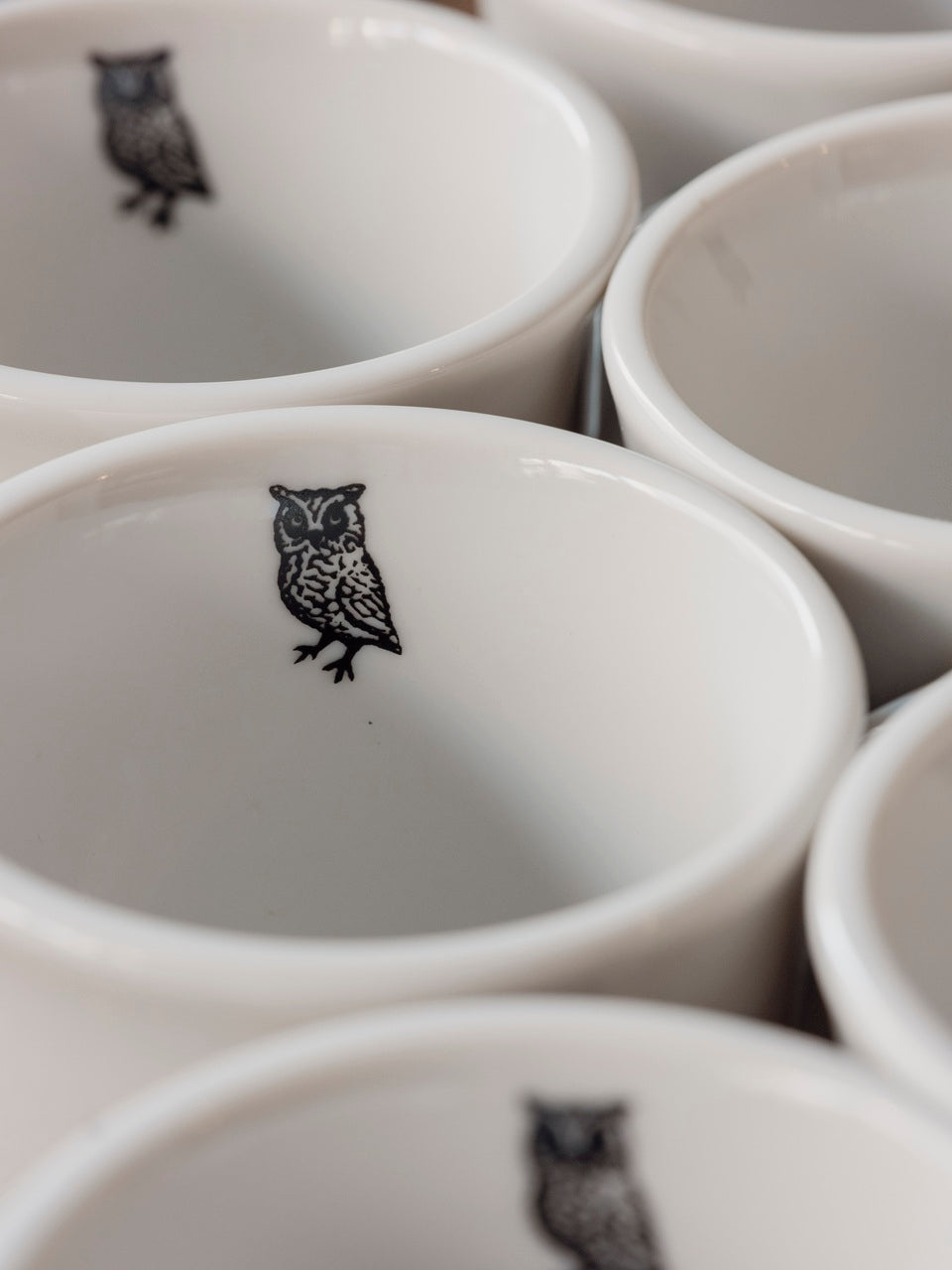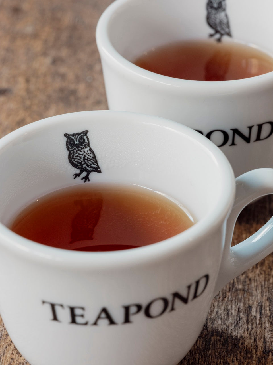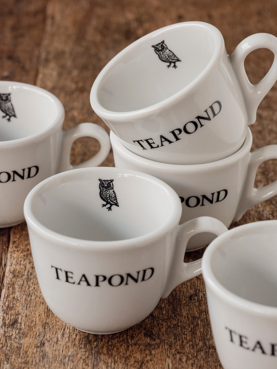 TEAPONDのロゴとカップの内側にフクロウのマークが印刷されています。フクロウの足元までお茶を注ぐとおおよそ50mlとなります。オフホワイトのシンプルで、丈夫な作りが魅力です。 茶葉をポットに入れっぱなしにして、抽出時間を重ねた味わいの変化を楽しみたい方や中国茶を工夫式で煎を重ねて味わいたい方にもおすすめです。