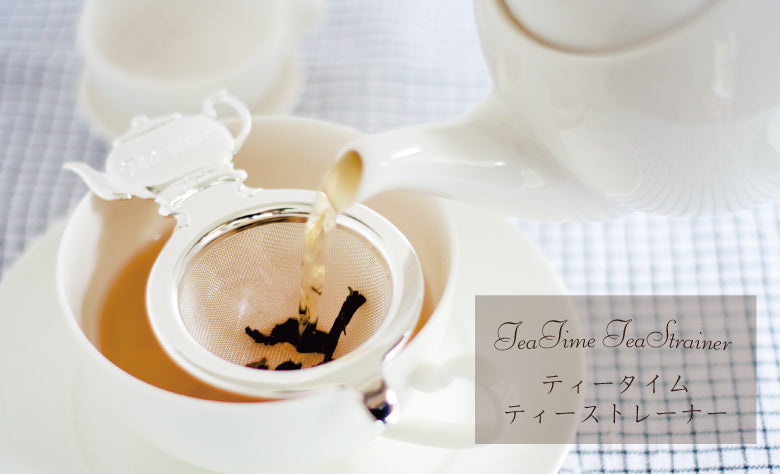 A set of a tea strainer with a teapot design on the handle and a small saucer in the shape of a teacup.