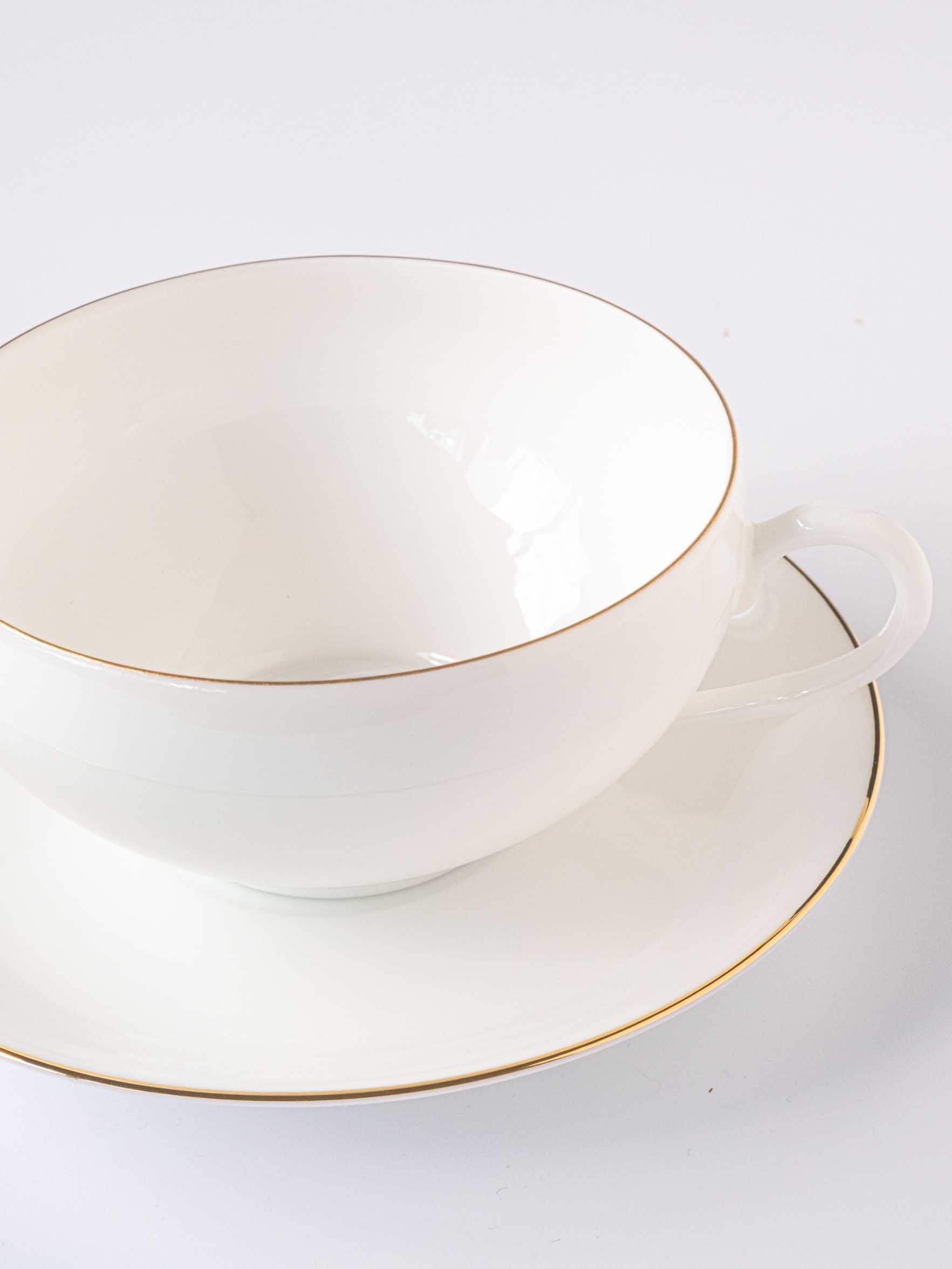 A thin gold line on the rim of the cup and saucer.